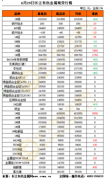 4月29日长江有色金属现货行情 2026-04-29 来源:长江有色金属网 发布人:yangxf 短信订阅 看第一时间报价 数据通 查价格数据和走势 有色通 建商铺做产品买卖 展开全文 📱点击进入长江有色网app查看更多 【免责声明】:文章内容如涉及作品内容、版权和其它问题,请在30日内与本站联系,我们将在第一时间删除内容。文章只提供参考并不构成任何投资及应用建议。删稿邮箱:info@ccmn.cn
