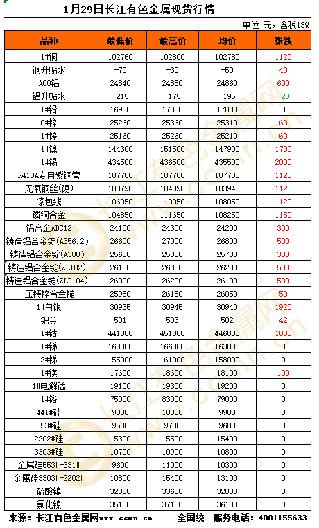 1月29日长江有色金属现货行情 2026-01-29 来源:长江有色金属网 发布人:yangxf 短信订阅 看第一时间报价 数据通 查价格数据和走势 有色通 建商铺做产品买卖 展开全文 📱点击进入长江有色网app查看更多 【免责声明】:文章内容如涉及作品内容、版权和其它问题,请在30日内与本站联系,我们将在第一时间删除内容。文章只提供参考并不构成任何投资及应用建议。删稿邮箱:info@ccmn.cn