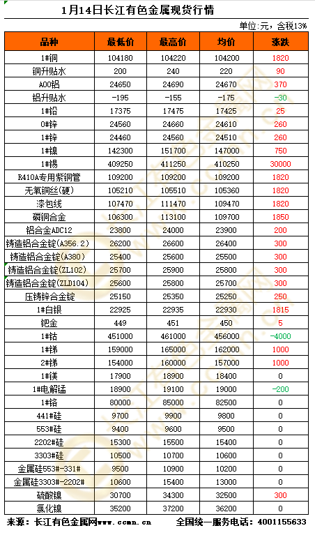 1月14日长江有色金属现货行情 2026-01-14 来源:长江有色金属网 发布人:yangxf 短信订阅 看第一时间报价 数据通 查价格数据和走势 有色通 建商铺做产品买卖 展开全文 📱点击进入长江有色网app查看更多 【免责声明】:文章内容如涉及作品内容、版权和其它问题,请在30日内与本站联系,我们将在第一时间删除内容。文章只提供参考并不构成任何投资及应用建议。删稿邮箱:info@ccmn.cn