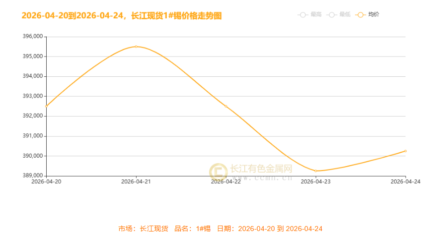 本周本周(2026年4月20日至24日)长江现货1#锡走出典型的“倒V型”行情,高位剧烈震荡后全周微幅收跌。 具体表现为:周初仅两日便飙涨6750元/吨至395500元/吨的周内高点,随即迅速反转,两日内回吐逾九成涨幅并探底389250元/吨;虽于周五小幅反弹至390250元/吨,但未能扭转颓势,全周累计微跌300元/吨。整体来看,市场前期冲高动能匮乏,中期抛压沉重,短期虽有企稳迹象,但仍处于高位回调后的震荡整固阶段。本周锡价波动受国际宏观多空因素双向主导,美元指数阶段性走强,美联储降息预期延后,大幅压制锡的金融属性,是价格回落的核心利空。与此同时,中东地缘冲突持续升级,关键航运通道风险加剧,叠加原油、冶炼原料价格走高,推升锡生产成本,全球供应链担忧升温带来避险支撑,托底周尾锡价。当前锡市上行动能不足,高位回调后整体进入震荡整固阶段。